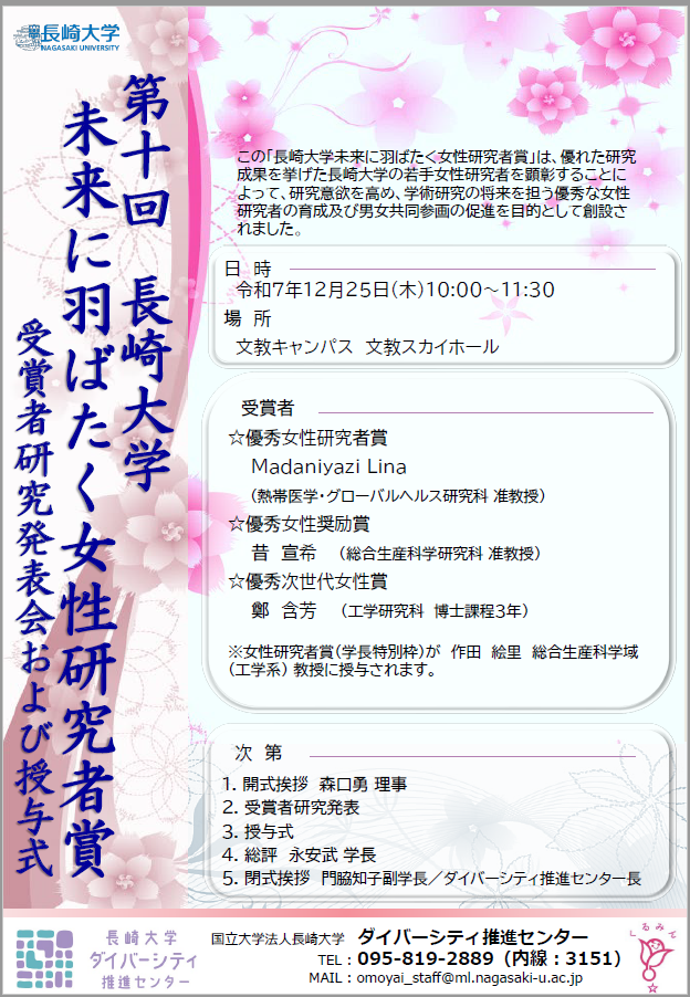 この長崎大学未来に羽ばたく女性研究者賞は、優れた研究成果を挙げた長崎大学の若手女性研究者を顕彰することによって、研究意欲を高め、学術研究の将来を担う優秀な女性研究者の育成及び男女共同参画の促進を目的として創設されました。