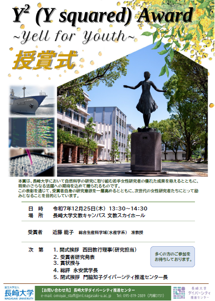 長崎大学(以下「本学」)では、我が国の科学技術を担う優れた若手女性研究者を称える「Y²(Y squared) Award ~Yell for Youth~」を創設しました。本賞は、本学の自然科学系研究科に所属する若手女性研究者の優れた研究成果および将来の活躍への期待を表彰するものです。これにより、受賞者自身の研究意欲をさらに高めるとともに、次世代の女性研究者たちの励みとなることを目的としています。
